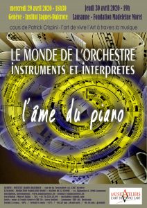 Cours et atelier animés par le chef d’orchestre et compositeur Patrick Crispini. Présentations de thèmes, d’auditions d’œuvres musicales au piano, ainsi que d’un choix de documents inédits lors d’une projection.